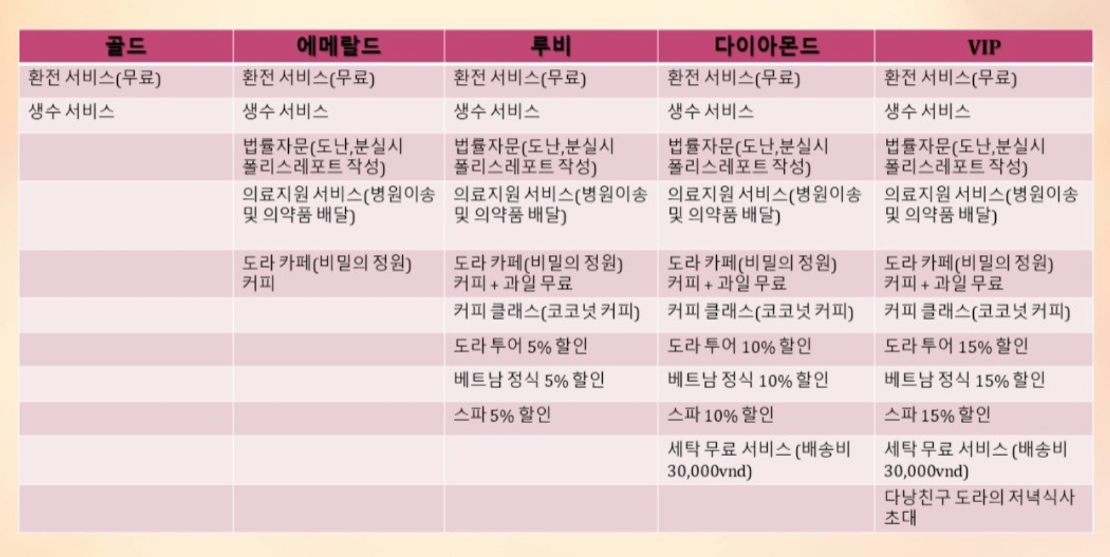 네이버 카페 활동에 따라 등급이 주어집니다. 도라여행사도 타 여행사와 마찬가지로 등급별 혜택이 주어집니다. 하지만 다른 업체처럼 까다롭게 등업을 해주지 않아서 쉽게 높은 등급으로 등업을 하실 수 있습니다. 저도 한 달 동안 카페활동을 하여 두 번째로 높은 등급인 다이아몬드 등업되어 여행사를 이용했었습니다. 다이아몬드등급부터 좋은 점은 바로 도라여행사 제휴 스파 10%와 런드리서비스 무료(배송료 약 1,700원만 부과)입니다. 타 한국인 여행사의 제휴마사지샵은 한국인사장님이 대다수라 금액면으로도 현지마사지보다는 1.5배~2배가량 비싼데 거기서 최소 10%~40%까지 제휴할인 해줄 때도 있습니다. 최대 40% 할인받아도 현지마사지샵보다는 금액이 나가는 게 보통입니다만, 도라여행사는 현지인 가성비업체와 제휴를 맺어 등급별로 최소 5% ~ 15%까지 할인이 되는데 원래 저렴한 금액에 더 할인이 들어가니 핫스톤이나 오일 마사지를 2시간에 약 25,000원에 받으실 수 있습니다. 외관은 그래 보여도 마사지사들이 워낙 경력자인 분들이 많아서 기억에 남았던 곳 중 한 곳이네요.