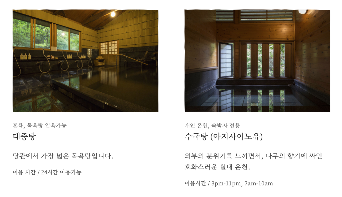 | 온천 수 | 노천탕 2, 대욕장 2, 전세탕 6 *24시간 사용 가능 |