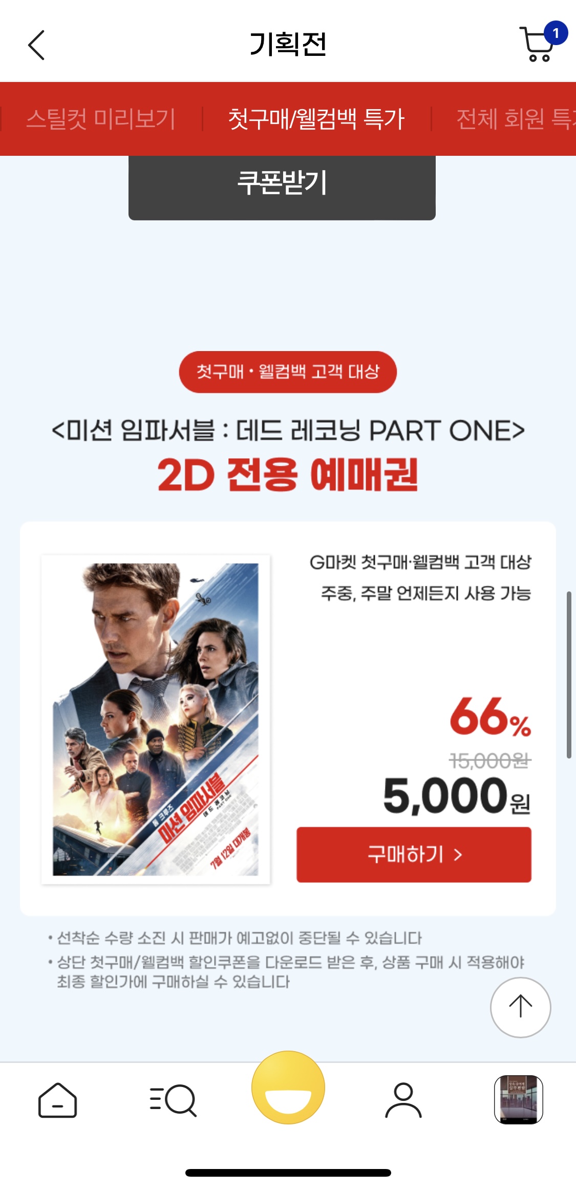 첫구매/웰컴백 2D 예매권 1만원 할인쿠폰 지마켓 전체 회원 대상 반값 할인!