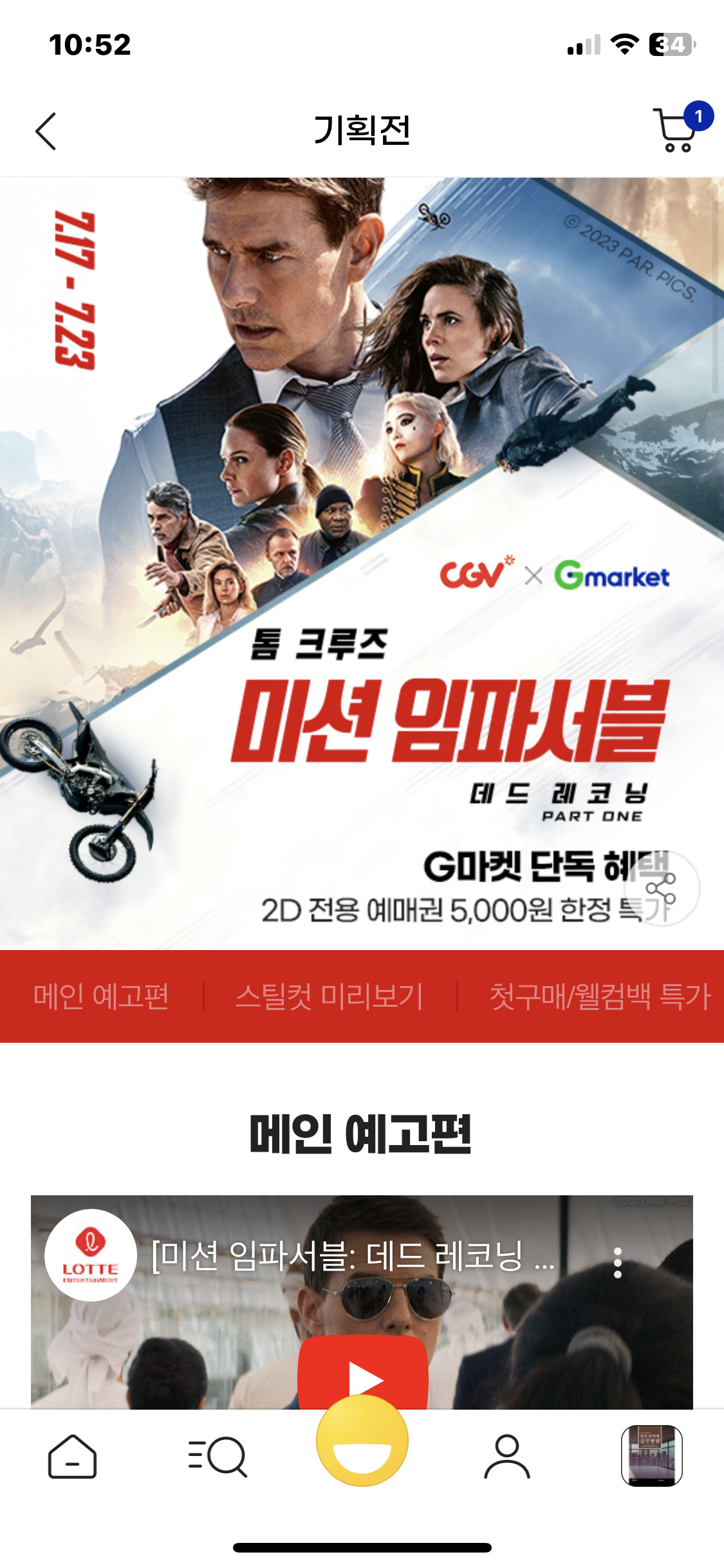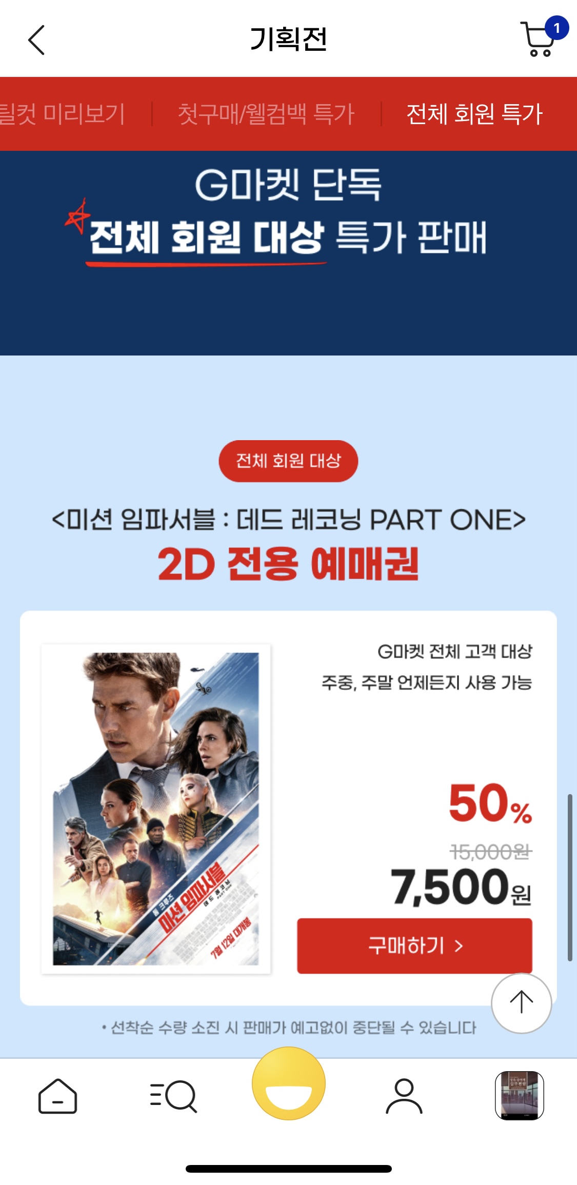 | 첫구매/웰컴백 2D 예매권 1만원 할인쿠폰 | 지마켓 전체 회원 대상 반값 할인! |