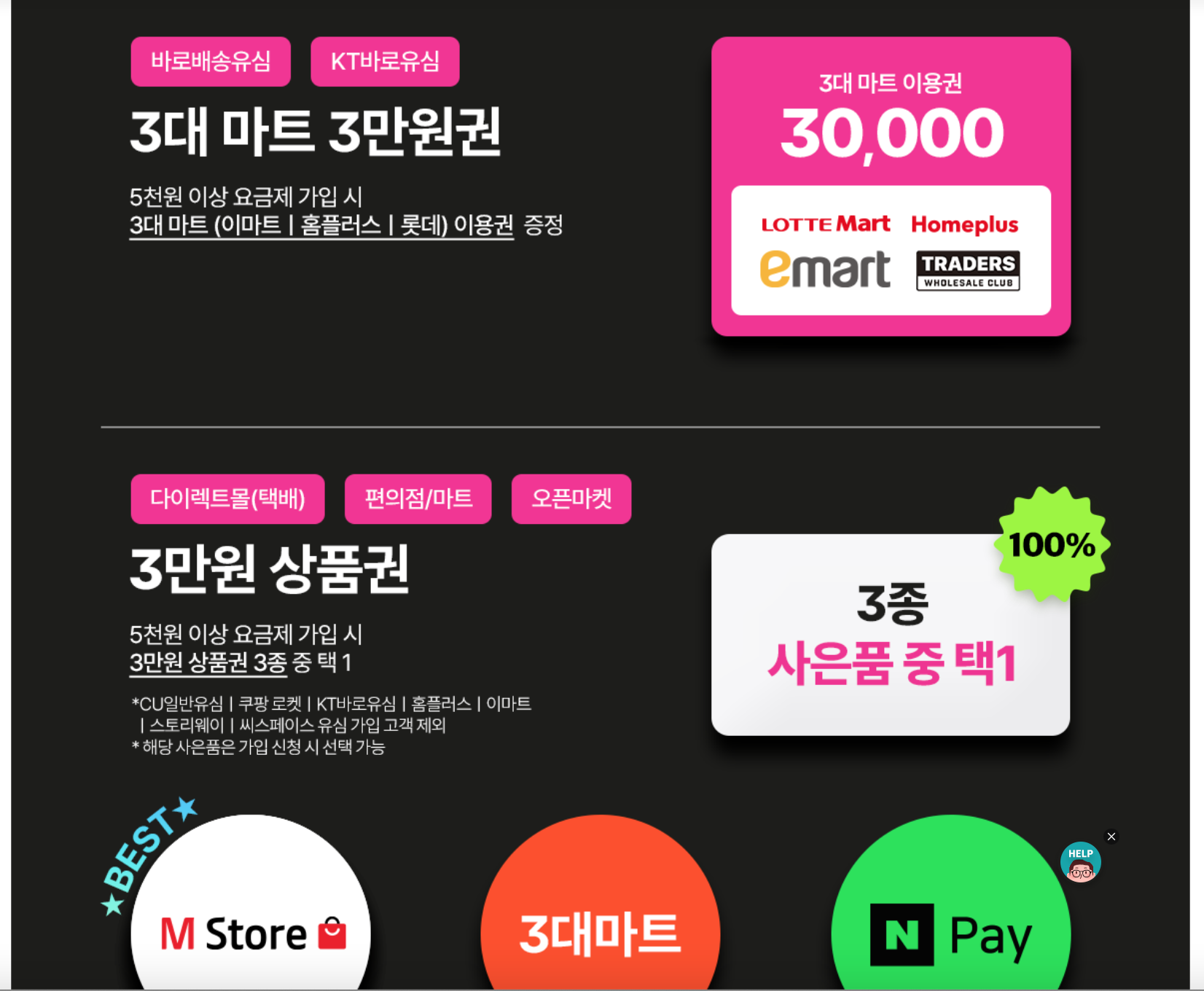 어디서 유심을 샀느냐에 따라 제공되는 가입선물이 살짝 다릅니다. 대체적으로 마트 3만 원 이용권을 제공합니다.