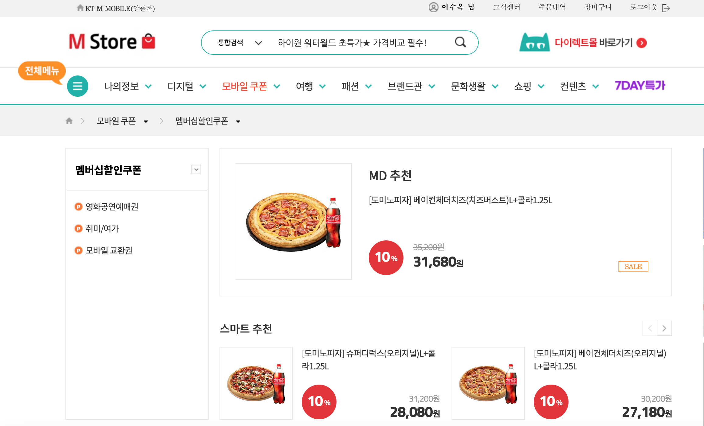 가입 후 이벤트에 있는 M스토어 선착순 1천 명에게 지급되는 5천 원 쿠폰도 발급받아 M스토어에서 물품들을 구매하실 수 있습니다. 기프티콘을 포함해 디지털, 여행, 패션등의 다양한 물품들이 있으니 한번 둘러보시길 바랍니다.