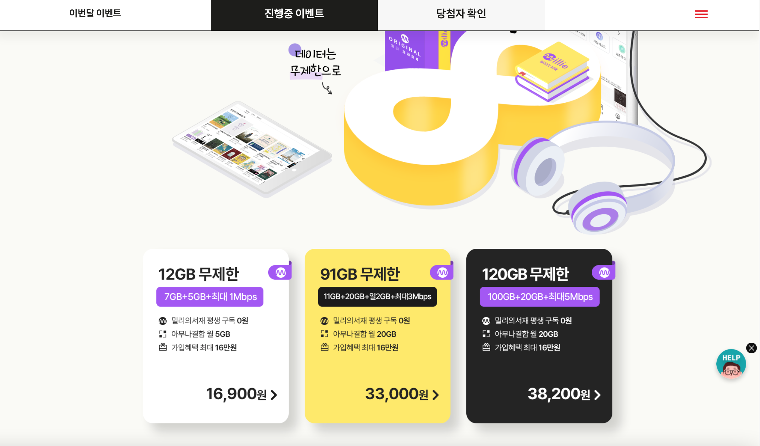 사실 와이파이가 잘 통하는 곳에 계신다면 제일 저렴한 요금인 16,900원을 추천드립니다. 7기가 소비 후 저속으로도 무제한 데이터를 사용가능한 요금제이지만 kt m 모바일의 강점은 바로! 아무나 결합 시 최소 5기가를 더 준다는 것입니다. 그렇다면 16,900원으로 12기가의 데이터를 사용가능하고, 통화와 문자는 무제한으로 이용가능한 아주 저렴한 요금제라고 생각됩니다. 거기에 독서를 좋아하신다면 밀리의 서재 평생 구독료를 0원으로 받으실 수 있습니다.