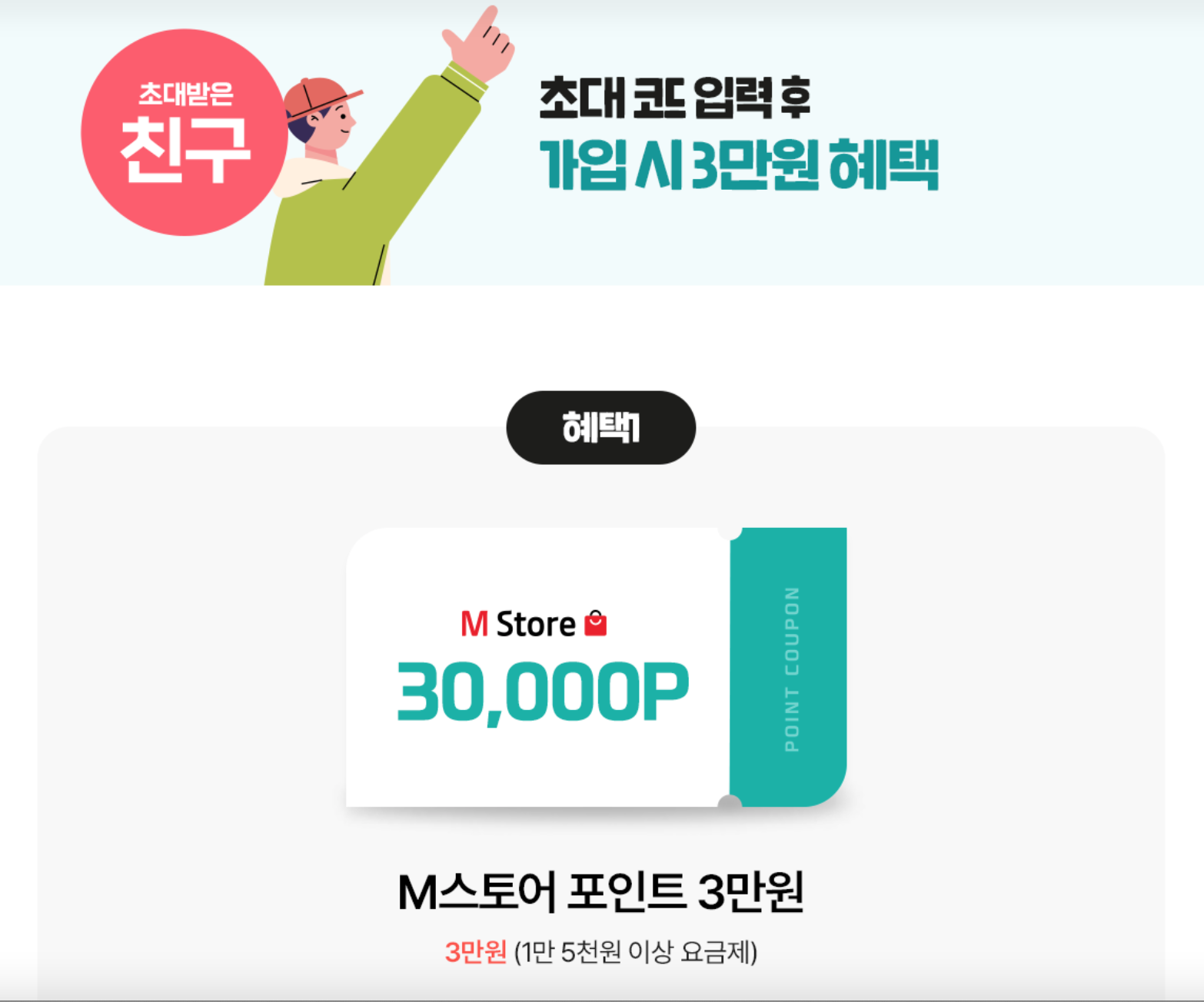 요금제 가입 맨 마지막장에 친구 초대 ID를 적는 기입란이 있습니다. 저의 글이 도움이 되셨다면, 친구초대 ID란에 Z1887을 입력해 주시거나, 가족분들 아이디를 입력해 주시면 초대한 사람과 초대받은 사람 두 분 다 M스토어 포인트 3만 원을 받으실 수 있습니다.