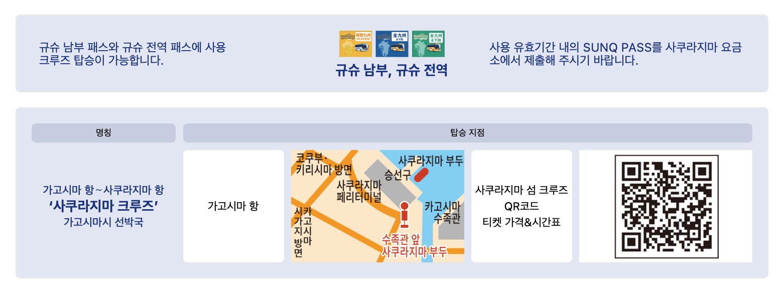 산큐패스에는 크루즈라고 적혀있지만 페리에 가까운 교통수단입니다. 크루즈 노선이 생각보다 많은데요. 저는 이중에서 모지코역에서 시모노세키(가라토)로 가는 크루즈를 이용해봤습니다. 시간당 세대정도 오고 가는 길까지는 5-10분정도로 굉장히 빠르게 도착해서 좋더라고요. 편도로 어른 400엔 왕복 800엔이 듭니다. 가격은 항구마다 다를테니 참고해주세요!