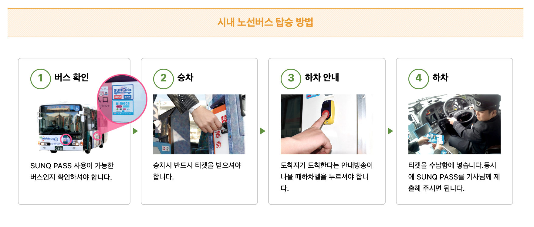 이전에 언급해드렸듯이 산큐패스는 시내버스, 고속버스, 크루즈(페리) 교통에 사용이 가능합니다. 사용방법은 간단합니다. 시내버스는 뒤로타고 앞으로 내리는데 뒤로타는 문에 옆에 SUNQ패스라고 적혀있고 아래 색깔표시가 되어있습니다. 전큐슈는 파랑색, 북부큐슈는 빨간색, 남부큐슈는 노란색으로 되어있어 본인이 소진한 패스가 있다면 그 버스는 무료로 탑승이 가능합니다.