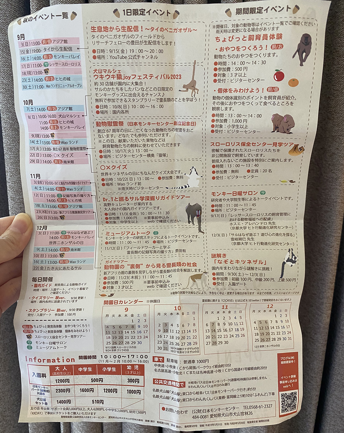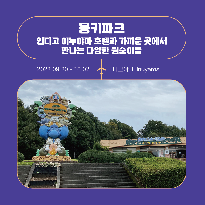 나고야에서 지하철 급행 기준 약 30분 떨어져있는 이누야마는 "개의 산"이라는 뜻을 가지고 있습니다. 하지만, 이누야마에서는 개보다는 원숭이를 볼 가능성이 훨씬 높습니다. 객실, 조경, 서비스, 온천, 조식 등으로 유명한 인디고 이누야마에서 약 차로 10분정도 떨어져있는 몽키파크/몽키센터가 있습니다. 이 곳은 약 50만평방미터의 아주 큰 규모로 놀이동산, 식물원, 70종 이상의 영장류 650마리가 살고 있습니다.