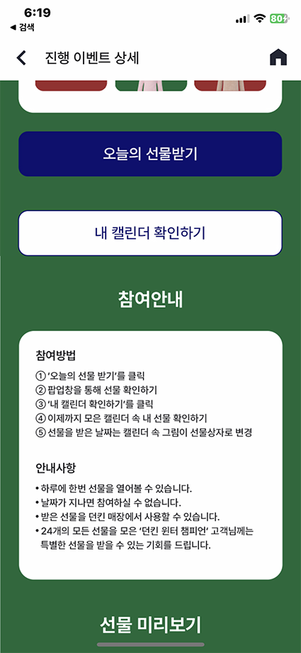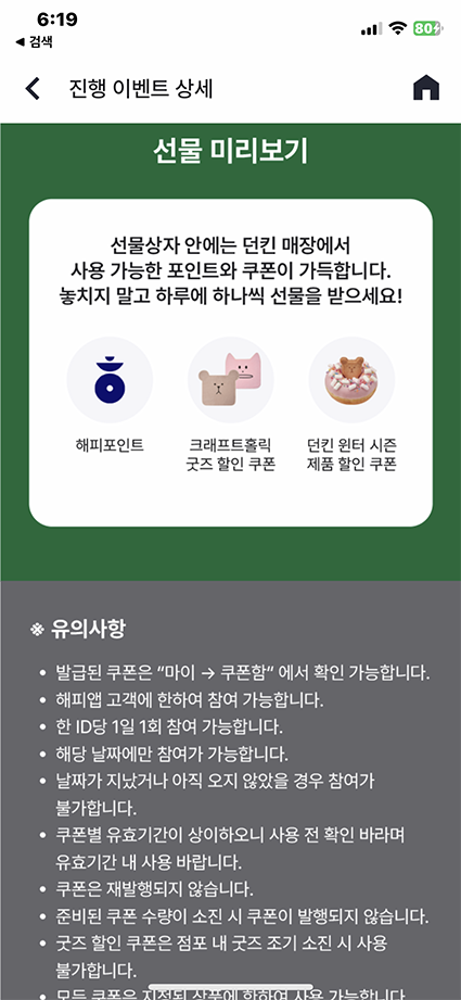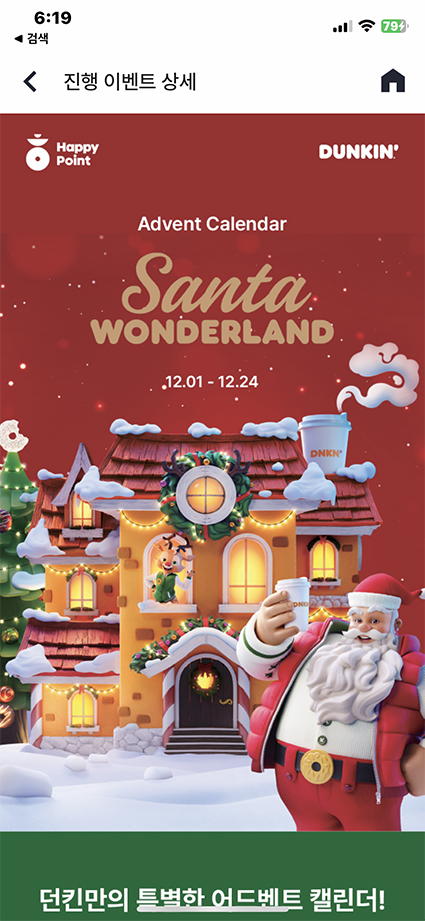 던킨도너츠 어드벤트 캘린더는 해피포인트 앱에서 확인가능하고, 이벤트 19번째 정도에 나와있습니다. 잘 모르겠다 하시면 모바일에서 이링크를 눌러주시면 해당화면으로 넘어갑니다. 신세계와 좀 다른 점은 캘린더 날짜를 누르는 게 아니라 "오늘의 선물 받기"를 클릭하셔야 하고 당첨여부를 바로 팝업으로 안 알려줍니다. 당첨여부는 마이 - 쿠폰함에 들어가시면 어떤 쿠폰을 받았는지 확인하실 수 있습니다.
