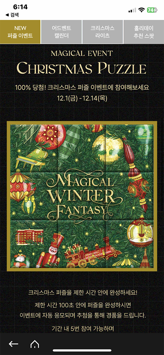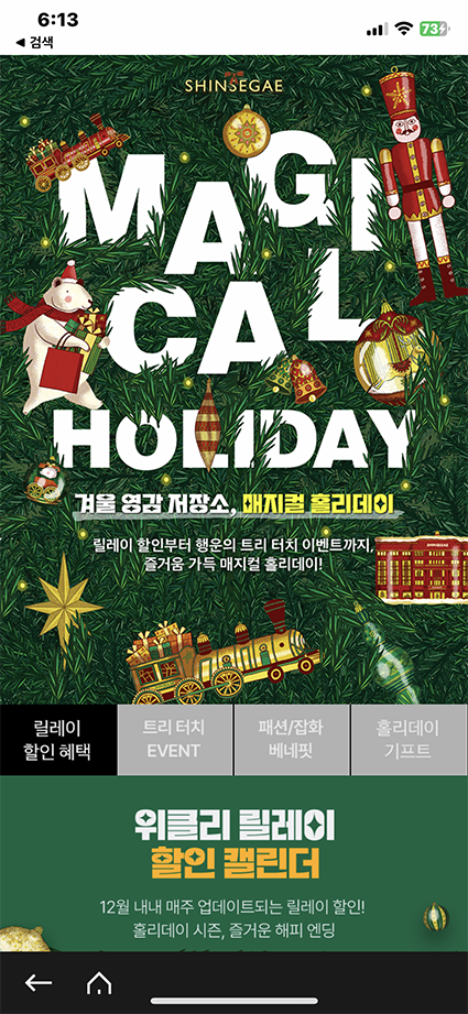 어드벤트 캘린더 전에 먼저 들어가 보셔야 할 곳이 바로 이 매지컬 홀리데이 이벤트입니다! 매주 쿠폰을 제공하고 있습니다. 다만, 이 쿠폰 사용은 신세계 제휴카드가 있어야 가능하니, 연회비가 낮은 거로 발급받으시거나 혜택이 좋은 거로 발급받으셔서 12월 한 달 할인으로 꽉 찬 신세계 이용하시길 바랍니다! 저도 신세계 제휴카드가 없는데 공부해서 포스팅을 따로 곧 올려보도록 하겠습니다.