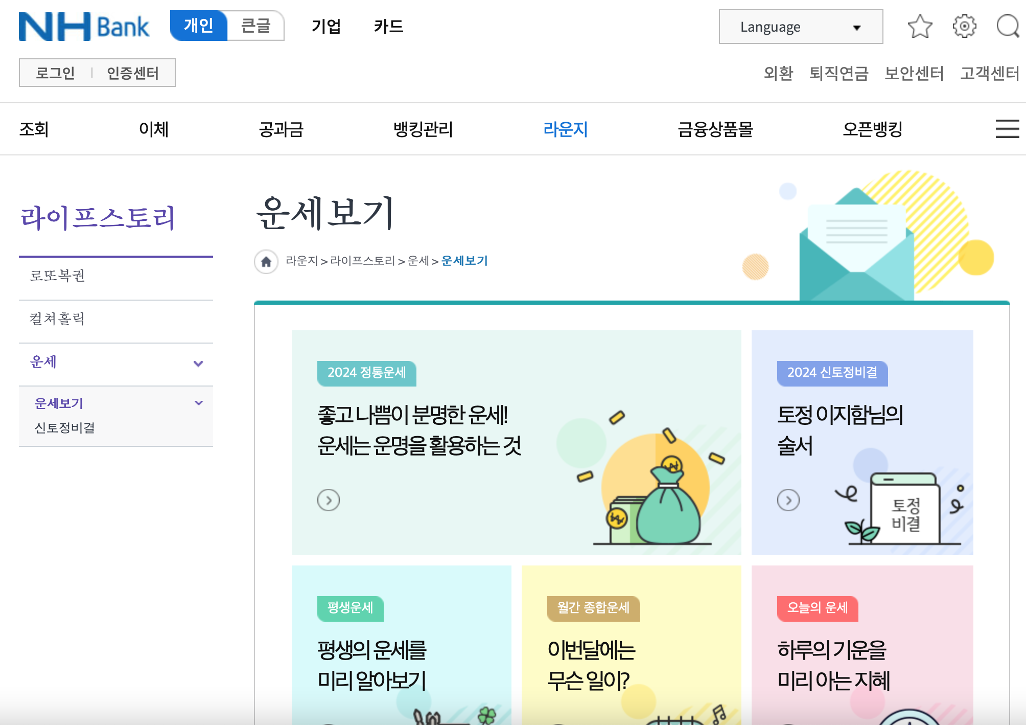 농협은행에서 진행하는 무료운세입니다. 신한생명과 더불어 농협은행 운세도 신년에는 인기가 참 많은 곳 중 하나입니다. 회원가입이 따로 필요없어 쉽게 PC 혹은 모바일로 확인 하실 수 있습니다.