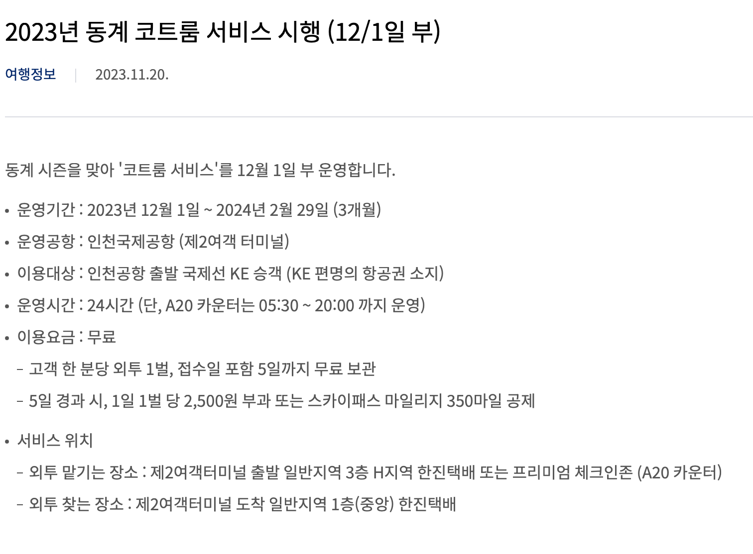 인천공항 제2터미널 외투보관서비스(코트룸)