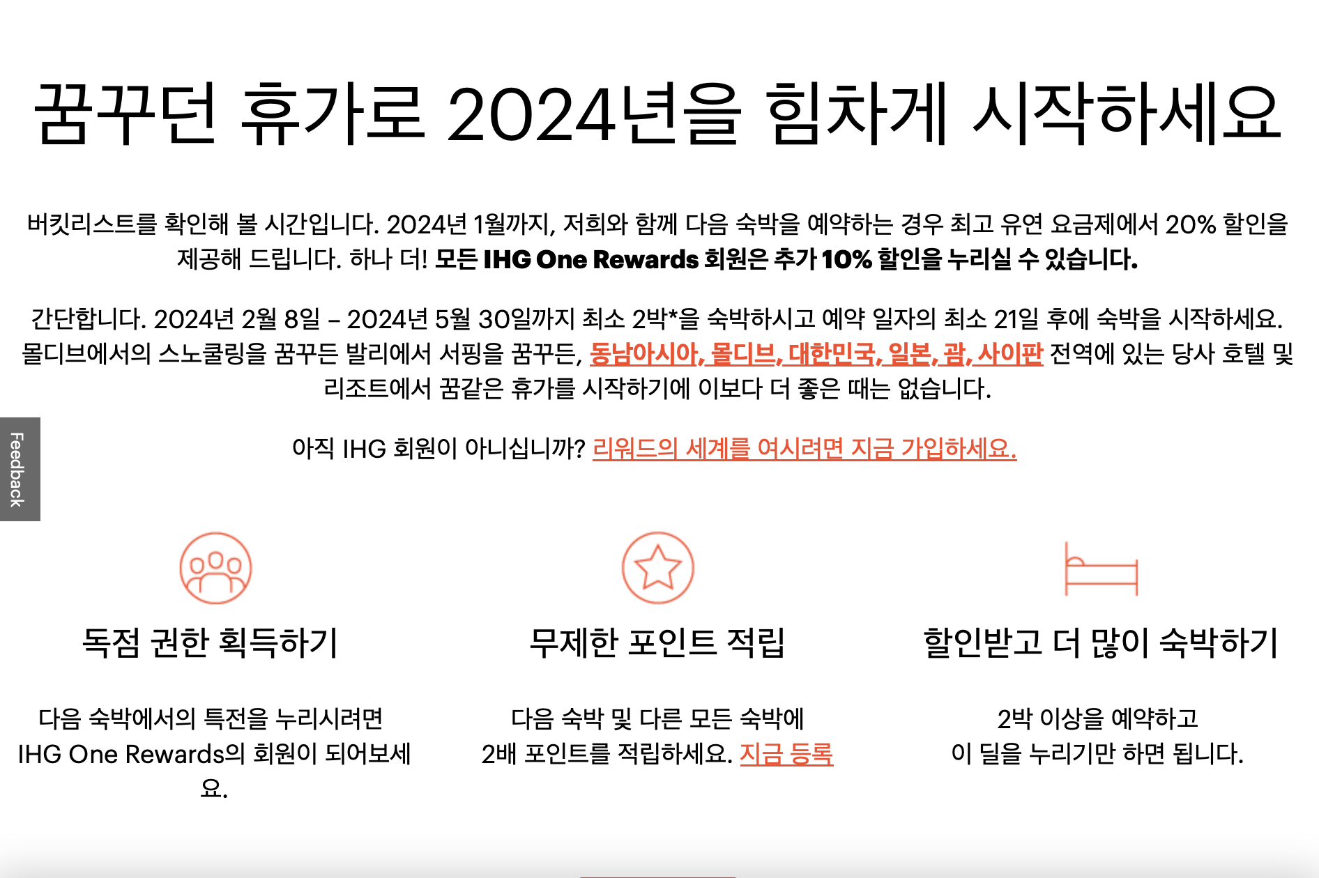 2024년에 들어서 첫 세일을 시작하는 IHG 호텔그룹사입니다. 30%라는 매력적인 할인율이지만 할인율만큼 프로모션의 조건도 조금 까다로운 점이 있습니다. 이 글을 잘 보시고, 이 프로모션이 본인에게 잘 맞다고 생각하신다면 프로모션기간에 예약하시면 좋을 거 같습니다.
