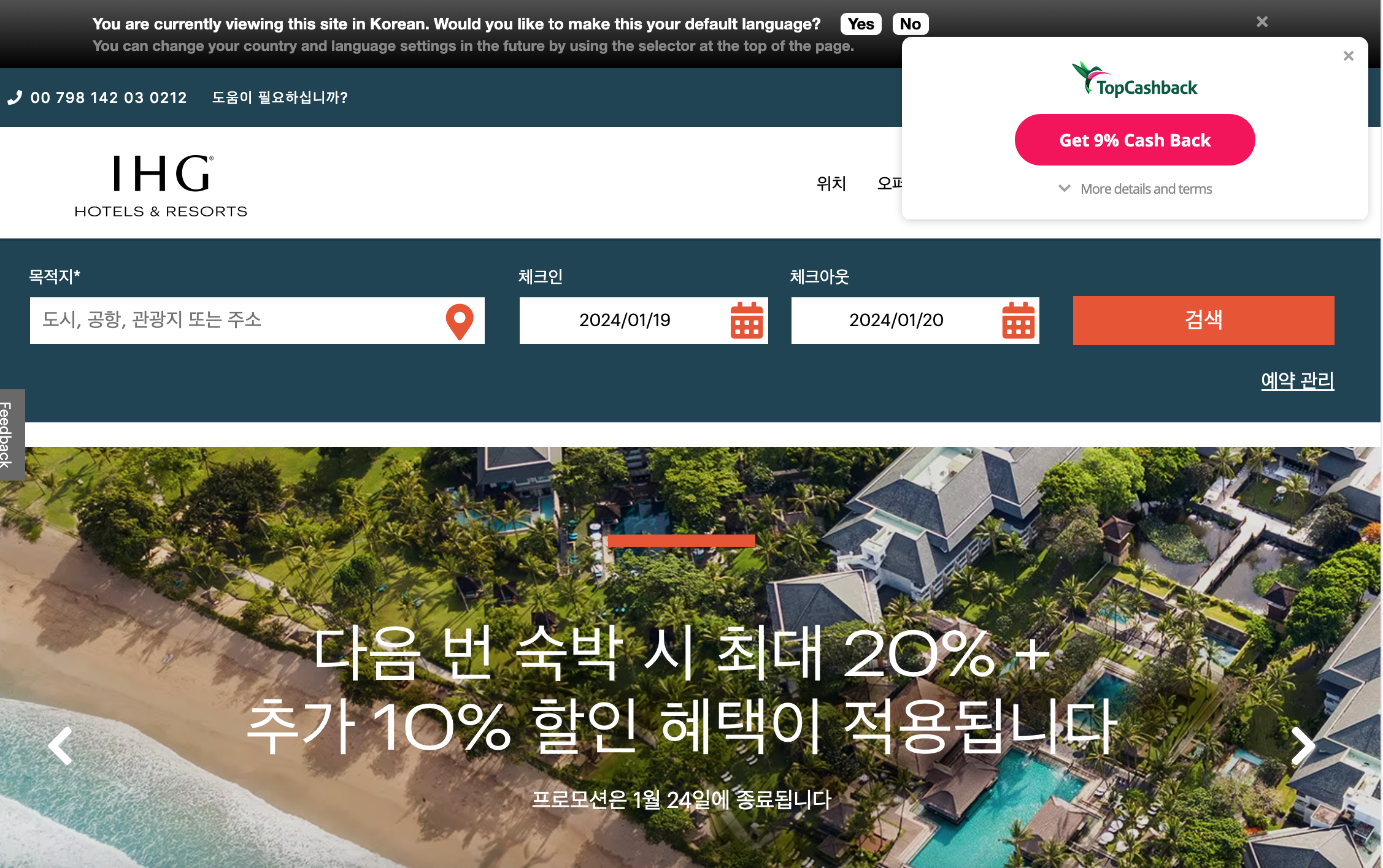 참고로 저는 TopCashback(해외사이트) / Shopback(국내사이트)을 이용해서 캐시백을 쌓는데요. 탑캐시백은 해외사이트라 USD(달러)로 적립이되며 국내사이트는 KRW(원)으로 적립이 됩니다. 달러던 원이던 저는 적립을 더 해주는 사이트를 통해 적립을 하는데요. 오늘자 2024년 1월 19일 기준으로는 IHG는 탑캐시백이 9퍼센트로 높은 적립률이라 이곳을 통해 적립을 할 거 같습니다.