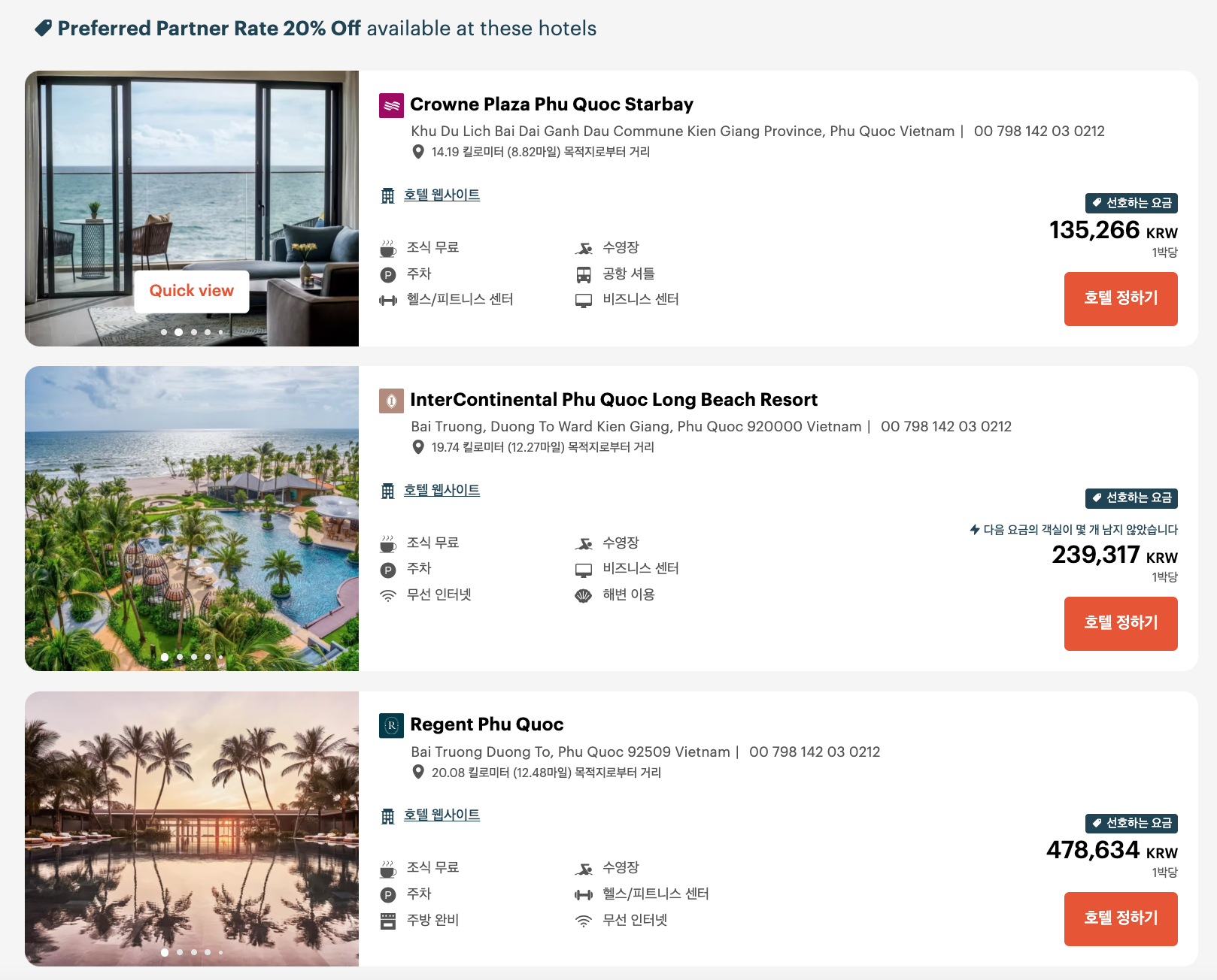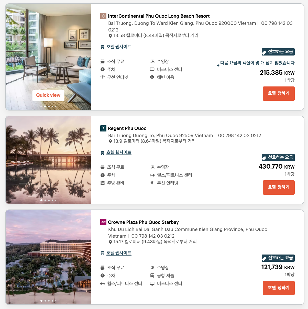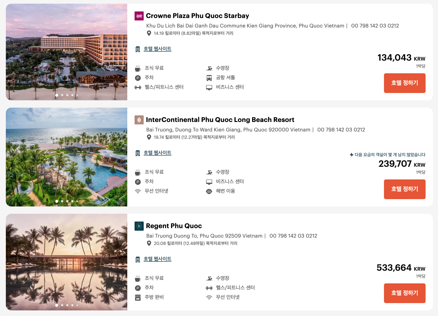 첫번째 이미지는 9월 기준 일반 가격이며, 두 번째 이미지는 플래시세일 3월 기준 가격이며, 세번째 이미지는 VISA세일 3월 기준 가격입니다. 일반가격을 9월로 한 이유는 3월 가격이 이미 프로모션으로 들어가서 제대로 된 금액을 확인하기 어렵지만 9월과 많은 금액이 다르지 않아 9월로 기준을 잡았습니다. 푸꾸옥여행을 제가 앞두고 있어 푸꾸옥에 있는 세 가지의 호텔 가격비교를 해보겠습니다.
