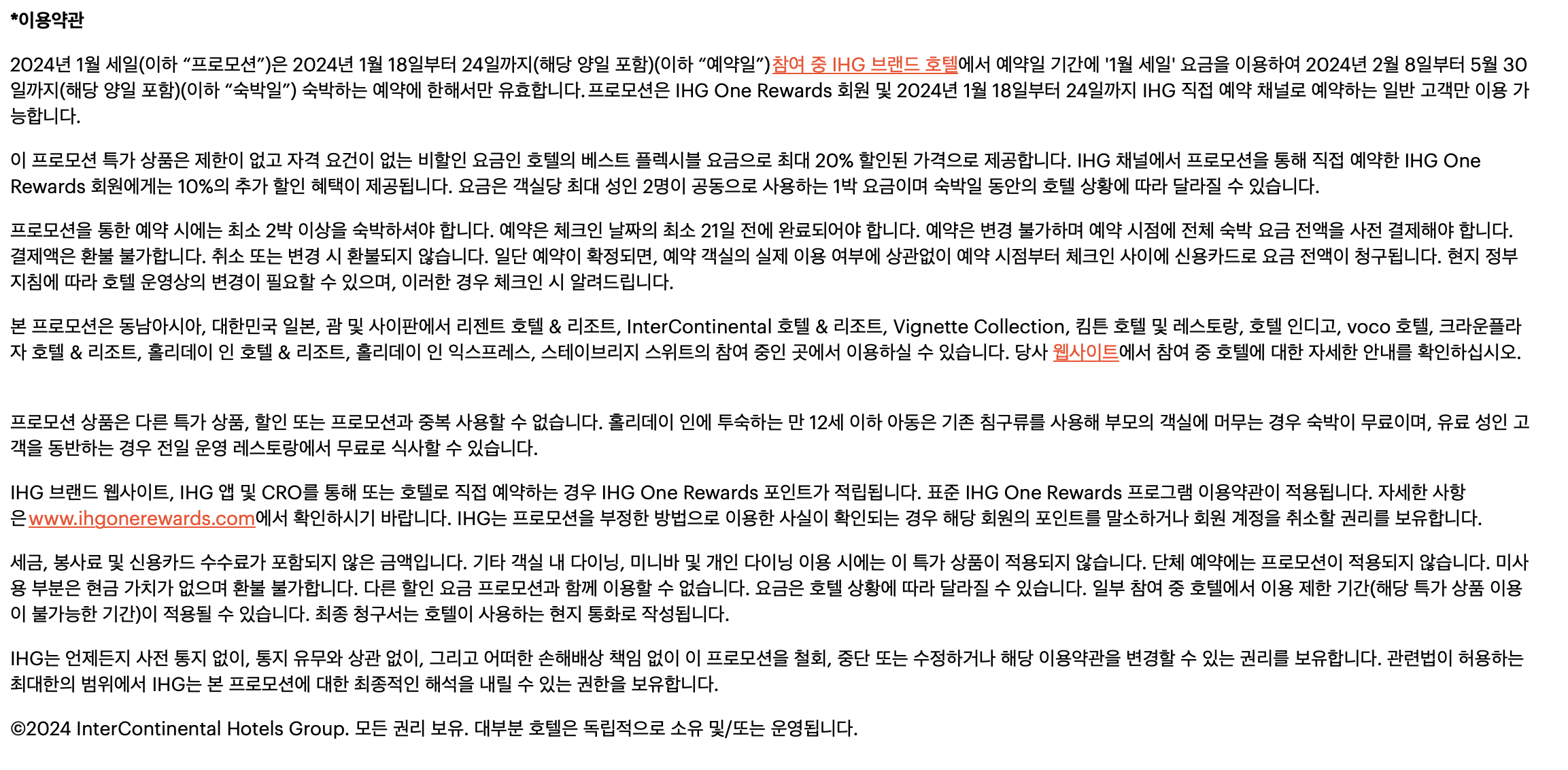 기본 20% 할인 + IHG회원일 시 추가 10% 할인 = 최대 30%