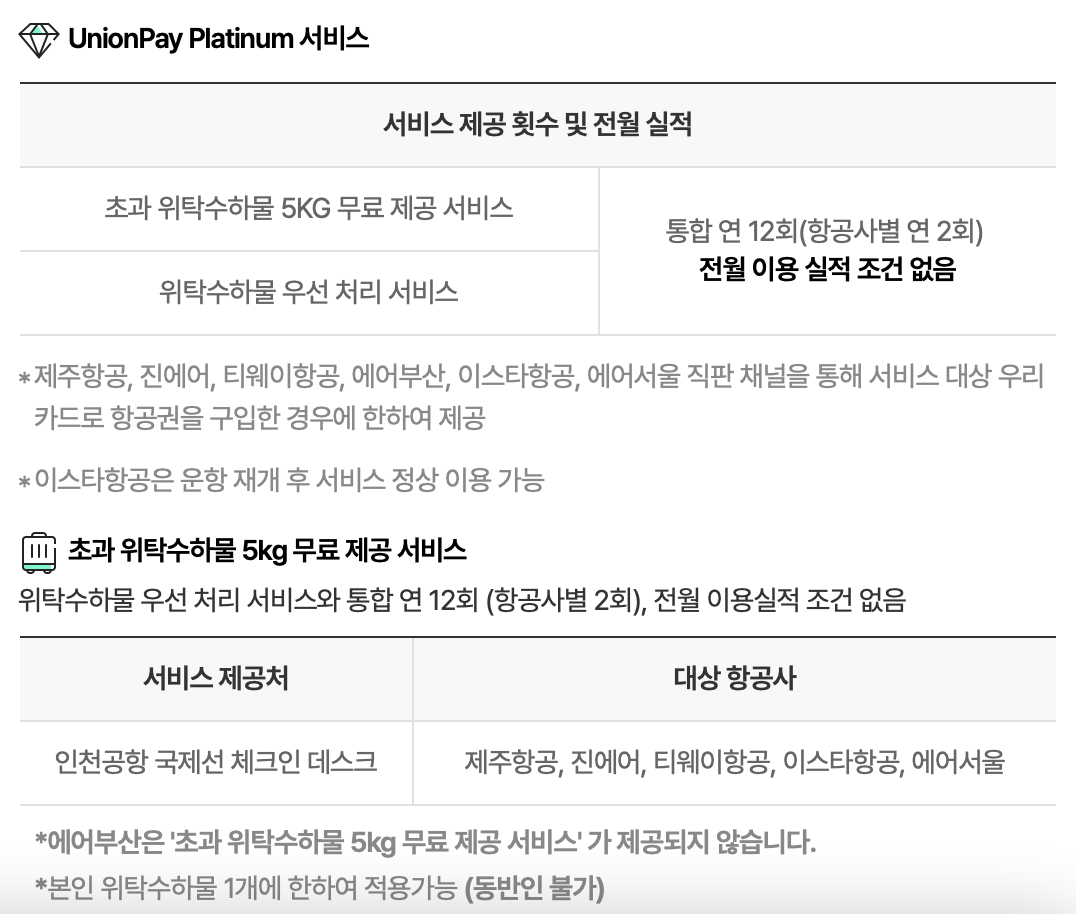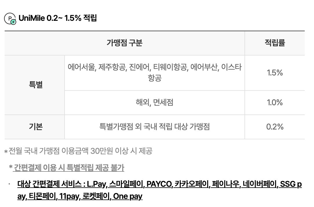 이 체크카드는 저가항공사 통합으로 이용가능한 유니마일리지가 적립되는 카드입니다. 기본 적립률은 0.2%라서 저는 실사용에는 그다지 추천드리지는 않습니다. 앞에 소개했던 국민 노리2 체크카드(GLOBAL)보다는 공항라운지를 2번 더 사용이 가능합니다. 그렇다면 왕복비행에 적용되지 않겠다고 생각하시면 조금 애매합니다. 출국일과 도착일의 월만 다르다면 전월실적만 채워주시면 왕복비행에 두 번 다 사용 가능합니다. 예를 들어 출발일이 3월 29일이고 도착일이 4월 1일이고 공항이용일도 동일하게 4월 1일이라면 라운지 2번 모두 같은 여행에 사용하실 수 있습니다.