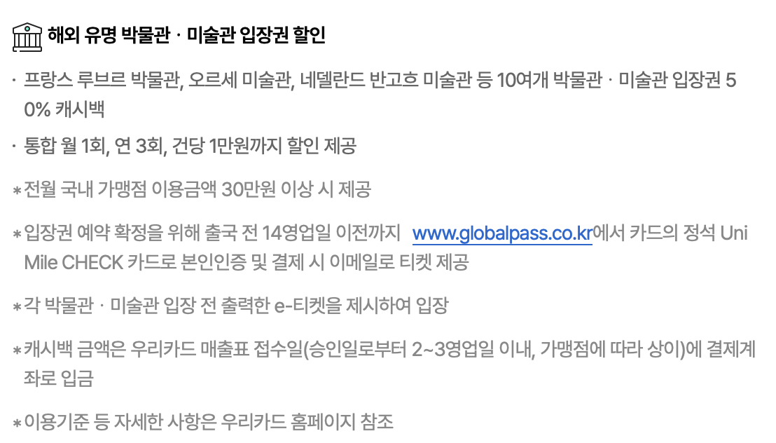이 체크카드는 실생활 할인이 되는 체크카드입니다. 체크카드에게 큰 할인폭을 기대하면 안 되지만 그래도 소소한 할인을 받을 수 있은 생활용에 적합한 카드라고 볼 수 있습니다. 단, 공항라운지는 딱 1번 주어지기 때문에 여행을 자주 안 가시는 분들 혹은 부모님을 모시고 가시는 분이라면 충분히 가치 있는 카드입니다. 라운지는 성인 1명에 $39 정도 하니 연회비 0원에 약 5만 원 이상의 혜택을 받아가는 거죠.