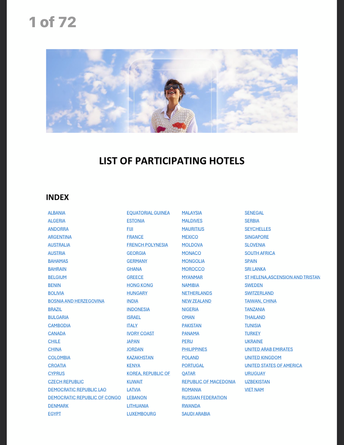 그리고 여기에 참여호텔에 한하여 15%할인이지만 대부분 된다고 보시면 됩니다. 본인이 숙박하고 싶은 곳이 할인적용 호텔인지 궁금하시다면, 할인 프로모션 배너를 클릭하신 후 맨 밑으로 내리시면 "See the list of participating hotels"를 클릭하신다면 밑에 이미지처럼 국가별로 잘 정리를 해놓았습니다.