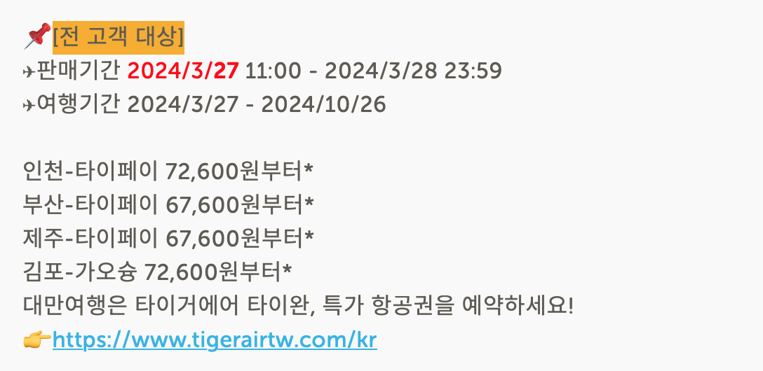 생소한 항공사이지만, 대만여행에 관심을 가졌던 분들은 한 번쯤은 들어보셨을 곳입니다. 바로 타이거에어인데요. 이 항공사는 대만과 싱가포르를 기반으로 한 저가 항공사입니다. 중화항공 그룹이 90% 지분과 싱가포르의 타이거에어 그룹이 10% 지분을 가지고 2013년에 합작하여 설립한 항공사입니다. 저비용 외국계 회사이지만 아래 이미지 캡처를 보시다시피 한국어 SNS 채널도 함께 운영하고 있습니다.