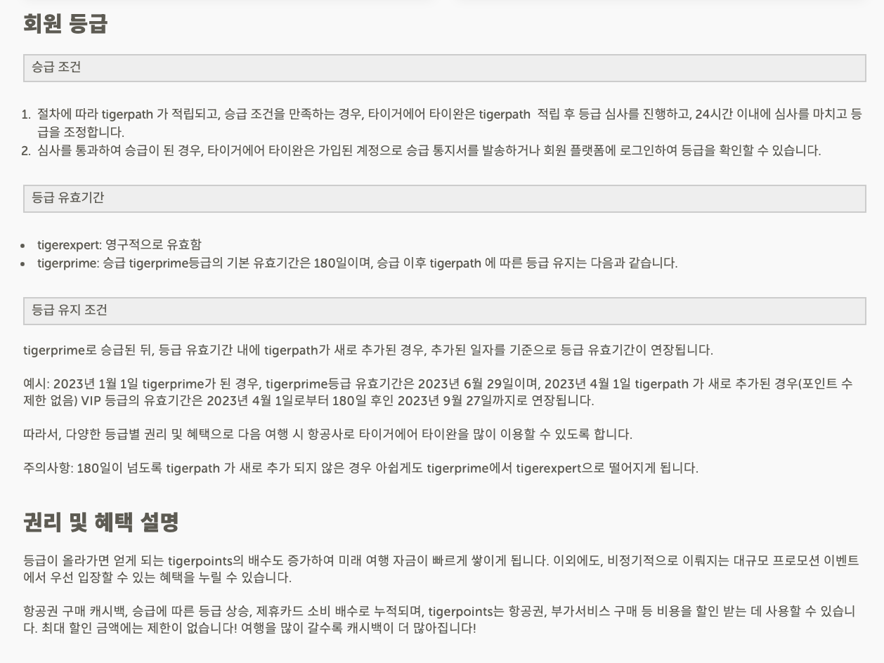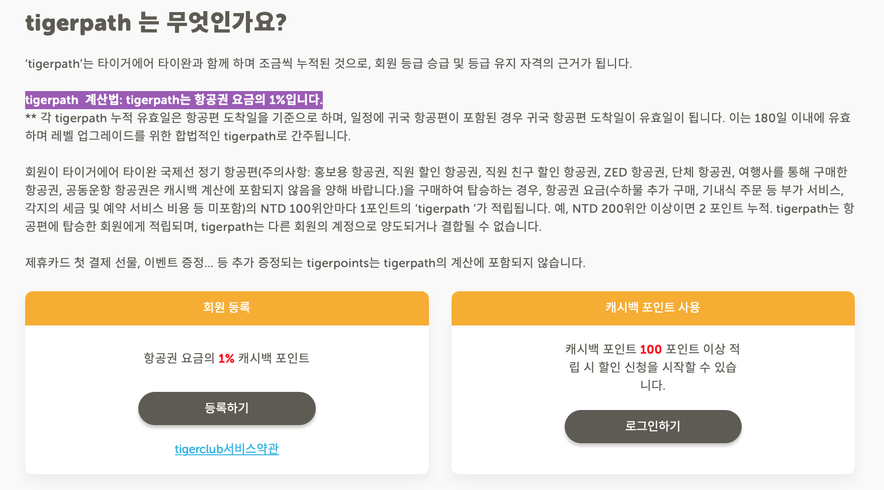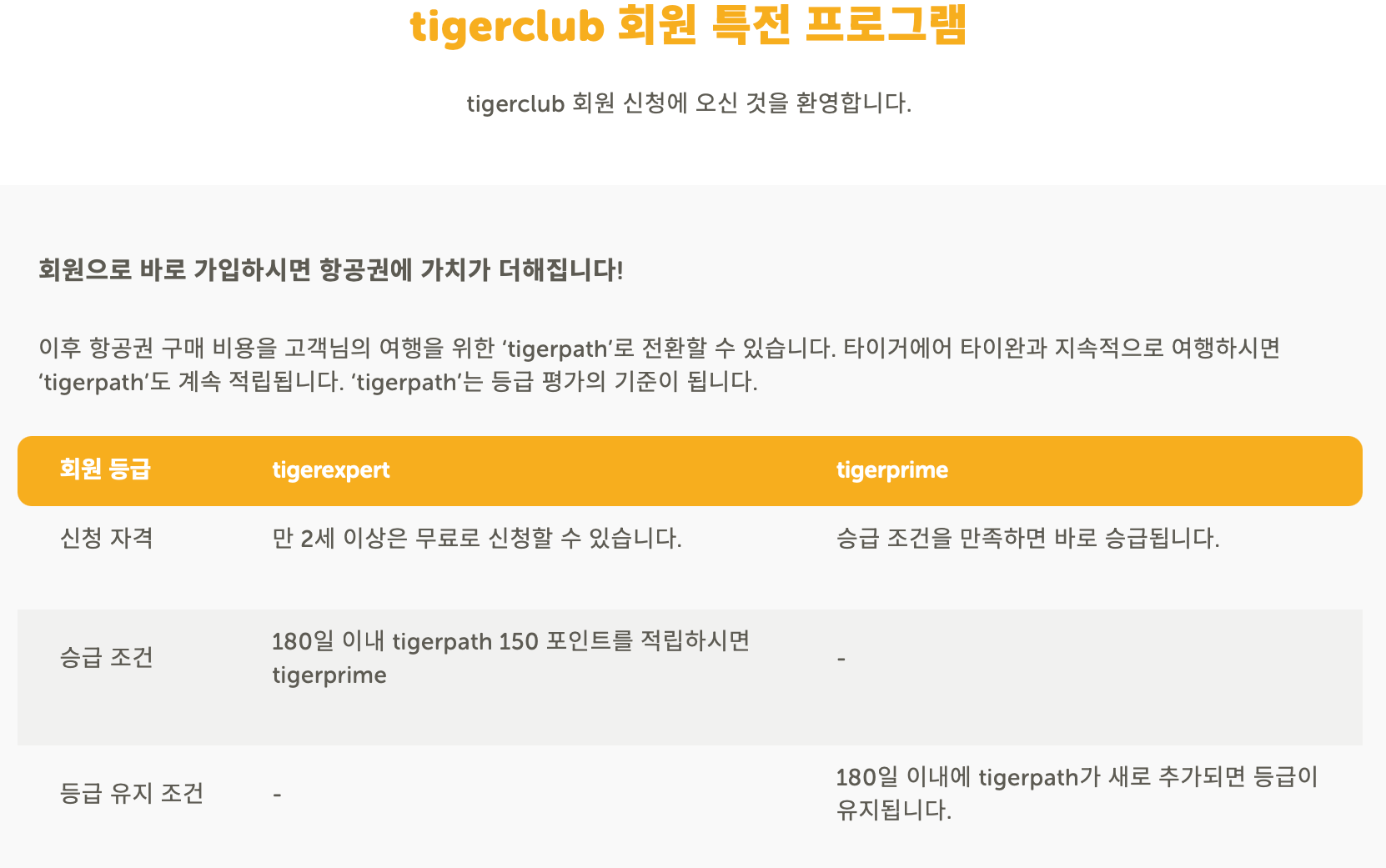 만 2세 이상이라면 누구가 무료로 tigerexpert(타이거 엑스퍼트)에 가입할 수 있습니다. 180일 이내에 tigerpath 150포인트를 적립하면 tigerprime(타이거 프라임)으로 승급됩니다. 승급을 유지하려면 180일 이내 포인트를 추가적립하시면 등급을 유지할 수 있습니다. 유지를 위한 포인트는 정해놓은 게 없어서 한번 180일 이내에 타이거항공을 1회만 더 탄다면 유지가 가능합니다.