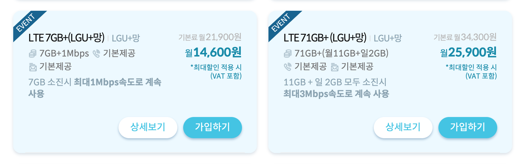 *리브엠의 요금제를 보시면 7GB 옆에 +(플러스)표기가 되어있다면 데이터 소진 후 최대 몇 Mbps 속도로 계속해서 데이터를 이용하실 수 있다고 나옵니다. 1Mbps정도면 조금은 느릴테지만 일반 웹서핑정도는 할 수 있고 3Mbps면 좀 더 빠른 속도로 사용이 가능합니다.