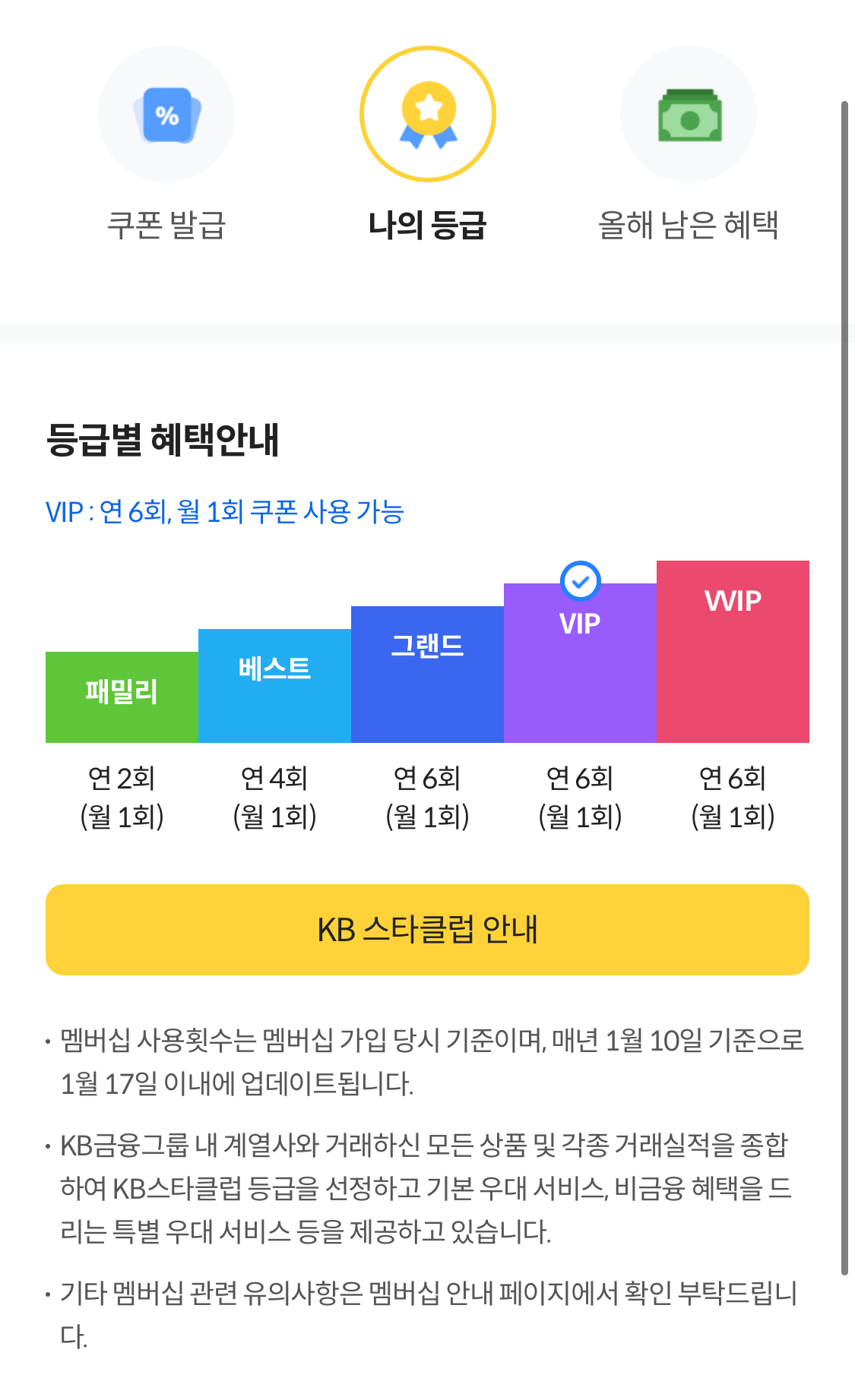 멤버십 쿠폰 제공의 대상자는 국민은행 KB스타클럽 모든 가입자들에게 드리는 혜택입니다. 그런데 제일 낮은 등급이 패밀리라면 연 2회 정도 쿠폰을 받으실 수 있고 그랜드 등급 이상부터 연 6회의 쿠폰 서비스를 제공받으실 수 있습니다. 제공받을 수 있는 쿠폰의 리스트가 이번년도 들어서면서부터 더 다양해졌는데 캡쳐 이미지 참고해주시면 되겠습니다.