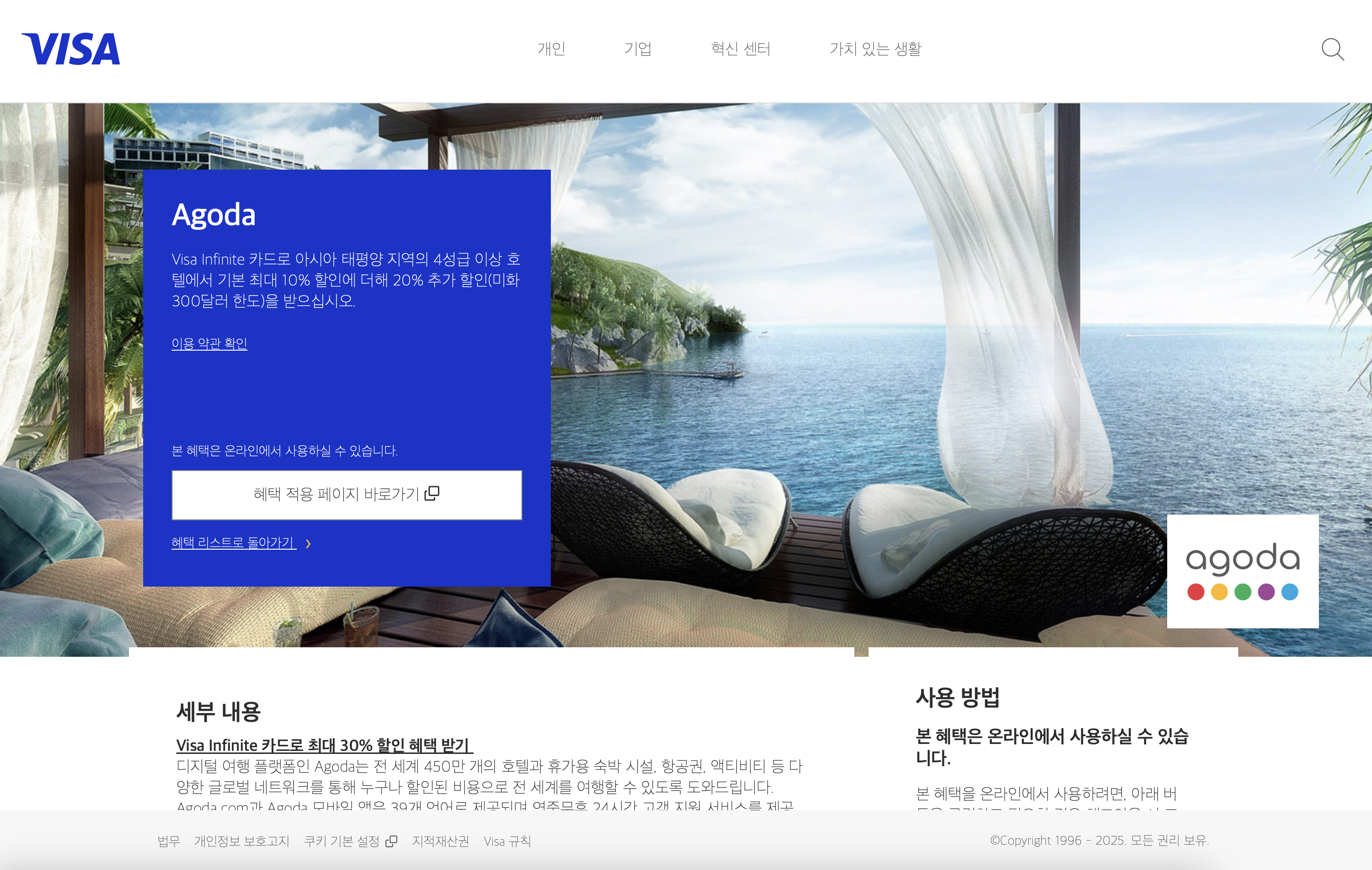 비자 인피니트 카드만 있으면 은행 상관없이 아고다 최대 30% 할인!