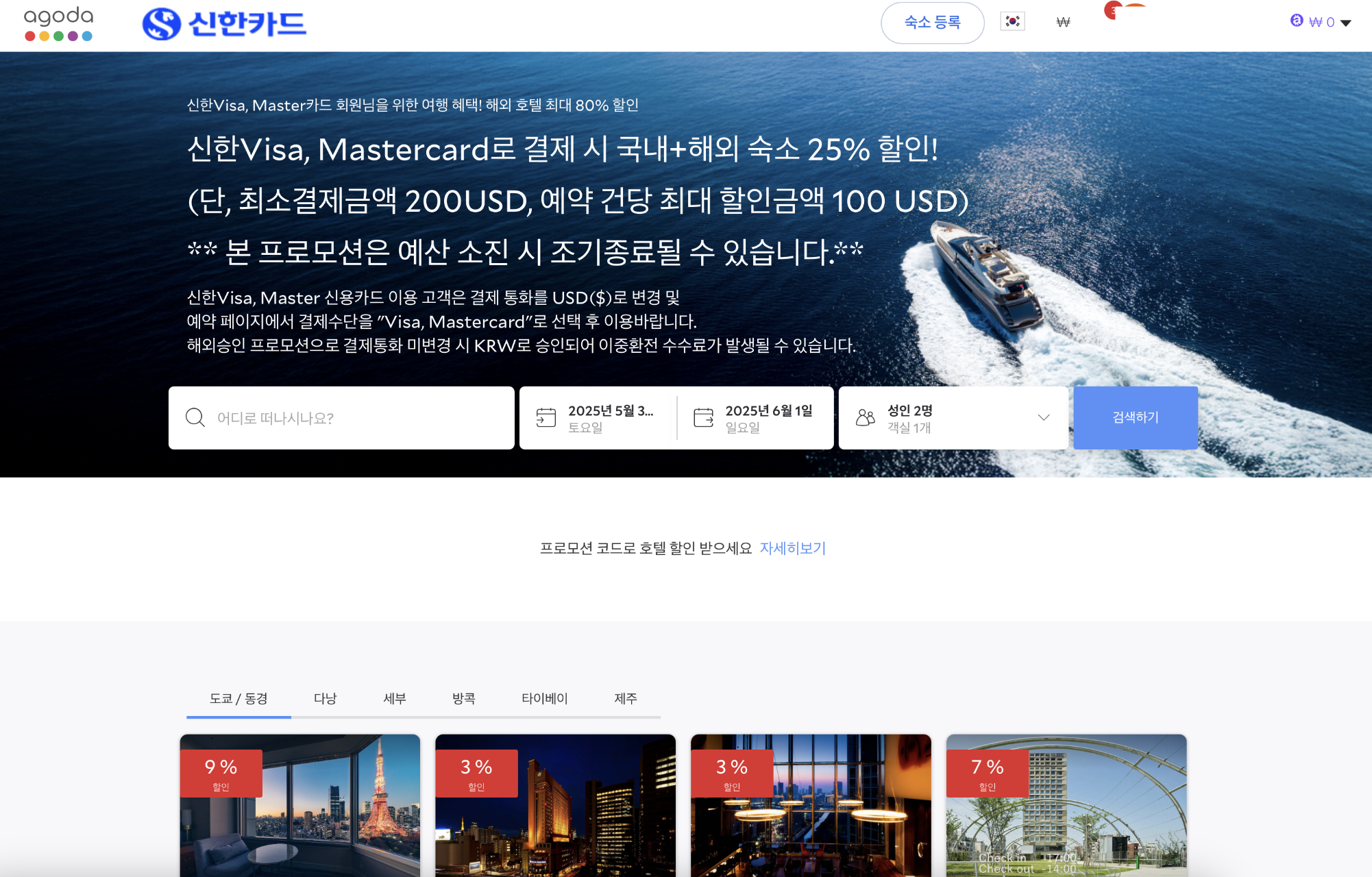 해외·국내 호텔 예약 시 아고다에서 신한카드로 결제하면 최대 25% 파격 할인을 누릴 수 있습니다.