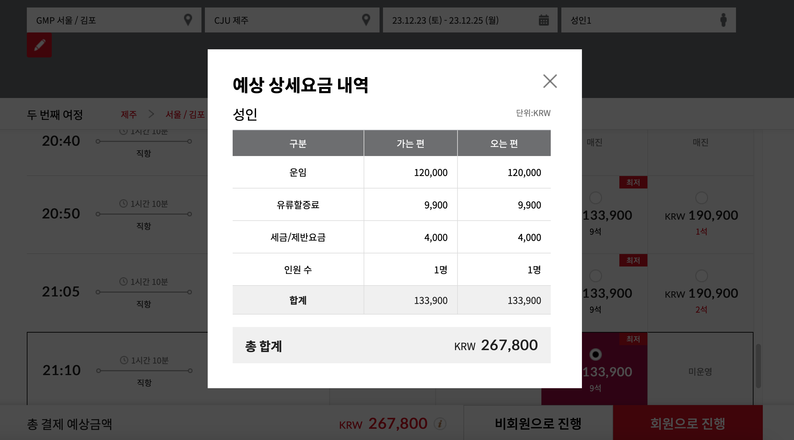 대한항공 : 1인 261,800원 + 동반자 세금 및 유류할증료 27,800원 + BC카드 발권 수수료 20,000원 = 총 309,600원 / 2인